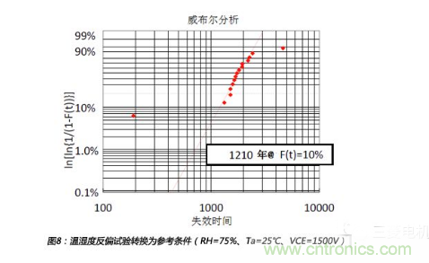 以上失效點(diǎn)集成為圖8所示的威布爾曲線圖,從圖中可以得到,在參考條件下F(t)=10%的壽命為1210年。同時(shí),在此威布爾分析中,排除了最大點(diǎn)和最小點(diǎn)。所以,在參考條件下,3.3kV IGBT的壽命LTb=1210年。