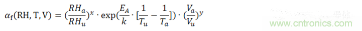 公式中,αf為測(cè)試的加速因子,也就是加速(后綴為a)測(cè)試條件下MTTF(Mean Time To Failures,平均無(wú)故障時(shí)間)與參考(后綴為u)測(cè)試條件下MTTF之比。EA是活化能,在0.79eV和0.95eV之間,k為玻爾茲曼常數(shù)。指數(shù)x為相對(duì)濕度的影響,指數(shù)y為電壓的影響,都是經(jīng)驗(yàn)數(shù)據(jù),但是必須通過(guò)實(shí)際評(píng)估來(lái)確認(rèn)。我們把此加速模型擴(kuò)展到壽命預(yù)估模型中。