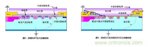 為了抑制IGBT芯片邊緣電荷集聚,SCC技術(shù)采用了優(yōu)化的半絕緣性材料替代傳統(tǒng)的絕緣材料,這個(gè)半絕緣性層為集聚的載流子提供了通路,如圖3所示,在高濕工況下,產(chǎn)生的載流子會(huì)通過(guò)半絕緣層傳遞出去,避免了電荷的大量集聚。