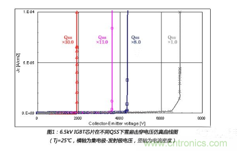 一般來(lái)說(shuō),擊穿電壓會(huì)隨著IGBT芯片邊緣電荷量QSS的增加而降低。圖1為6.5kV 高壓IGBT芯片的擊穿電壓隨著QSS變化的曲線圖。高濕度工況下的失效機(jī)理如下所述。