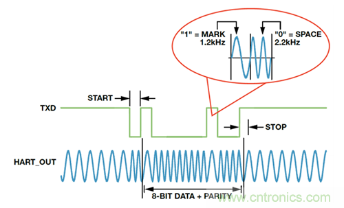 圖 2 顯示了調(diào)制涉及的主要模塊:FSK直接數(shù)字合成 (DDS)引擎、DAC(開關(guān)電阻串類型)和緩沖區(qū)。要發(fā)送的數(shù)字?jǐn)?shù)據(jù)通過UART輸入。調(diào)制器通過將RTS(請求發(fā)送)信號拉低來使能。調(diào)制器將TXD輸入端的UART編碼HART數(shù)據(jù)位流轉(zhuǎn)換成一系列二進制 1200 Hz(“1”)和 2200 Hz(“0”)信號音(見圖 3)。DDS在任何一種頻率下生成正弦數(shù)字字流,DAC將其轉(zhuǎn)換為大約 493 mV的p-p模擬正弦波。此正弦波信號在內(nèi)部進行緩沖并在HART_OUT引腳上輸出。該DDS引擎本身會產(chǎn)生連續(xù)相位信號,因此在頻率之間切換時避免了出現(xiàn)任何輸出不連續(xù)。在HART_OUT上進行內(nèi)部緩沖的主要優(yōu)勢是產(chǎn)生很高的驅(qū)動能力,無需外部模擬緩沖,也不會出現(xiàn)它們帶來的問題。HART_OUT引腳直流偏置至 0.75 V,并應(yīng)容性耦合至負載。有關(guān)更多詳細信息,請參見AD5700/AD5700-1 數(shù)據(jù)手冊。