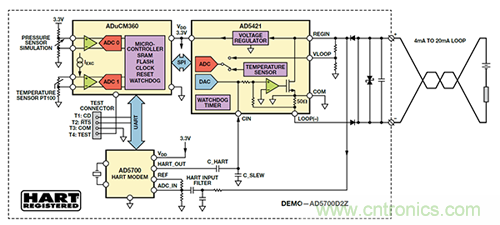 低功耗非常重要,因為環(huán)路供電的所有電路的功耗必須低于3.5 mA。圖 4 顯示了環(huán)路中的 HART 通信應(yīng)用示例。在 AD5700控制板上,AD5700 HART 調(diào)制解調(diào)器與 AD5421 16 位串行輸入環(huán)路供電型 4 mA 至 20 mA DAC 和 ADuCM360 微控制器接口連接,以演示用于測量壓力(“0”)和溫度(“1”)的兩個共享數(shù)據(jù)通道的環(huán)路供電型發(fā)射器電路。