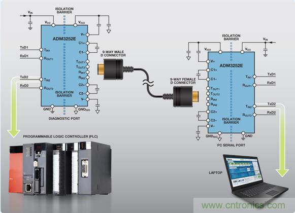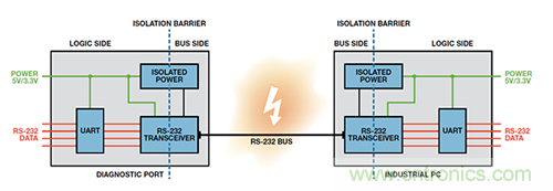 要提供隔離式 RS-232 通信接口,兩端的器件必須與所連的RS-232 電纜相互隔離。要隔離數(shù)據(jù)鏈路,則必須對數(shù)據(jù)信號線路和用于驅動該電纜的電源進行隔離。來自診斷端口上UART 的數(shù)據(jù)需要跨越隔離柵并傳輸至隔離總線側上的RS-232 收發(fā)器。本地 5 V/3.3 V 電源也需要跨越隔離柵來為隔離總線側上的 RS-232 收發(fā)器供電。工業(yè) PC 端也同樣需要如此:數(shù)據(jù)和電源均需要跨越隔離柵(圖 3).通過將器件與 RS-232 電纜網絡隔離開來,診斷端口和工業(yè) PC電路均受到保護,不受惡劣環(huán)境下可能耦合到 RS-232 電纜上的瞬變影響。隔離還可以中斷因診斷端口和工業(yè) PC 端存在不同接地電位而可能出現(xiàn)的接地環(huán)路。RS-232 總線上可能出現(xiàn)的高共模電壓不能跨越隔離柵,從而保護隔離數(shù)據(jù)的用戶。