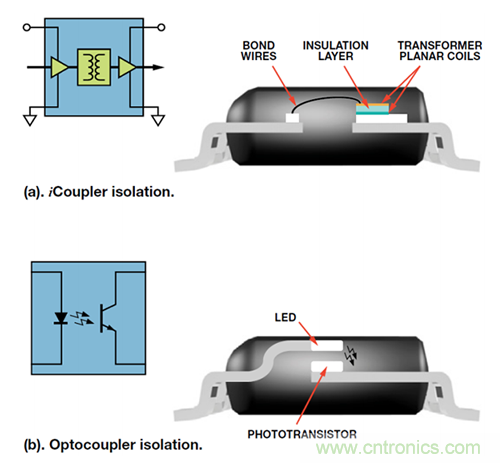 圖 4 比較了兩種主要隔離技術。iCoupler 技術(圖 4(a))利用厚膜工藝技術構建可實現(xiàn) 2.5 kV 隔離的微型片上變壓器,從而在 RS-232 系統(tǒng)中提供信號隔離。較古老但廣泛采用的光耦合器解決方案(圖 4(b))則采用發(fā)光二極管(LED)和光電二極管。LED 用于將電信號轉換為光,光電檢測器則用于將光轉換回為電信號。電光轉換本身的低轉換效率導致功耗相對較高;光電檢測器的慢速響應則限制其速度;而老化問題會限制其使用壽命。