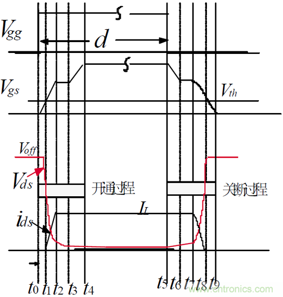-- [t0-t1]區(qū)間,MOSFET 的GS 電壓經(jīng)Vgg 對Cgs充電而上升,在t1時(shí)刻,到達(dá)維持電壓Vth,MOSFET 開始導(dǎo)電;