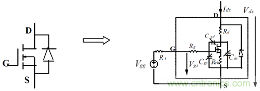 實(shí)際的功率MOSFET 可用三個(gè)結(jié)電容,三個(gè)溝道電阻,和一個(gè)內(nèi)部二極管及一個(gè)理想MOSFET 來等效。三個(gè)結(jié)電容均與結(jié)電壓的大小有關(guān),而門極的溝道電阻一般很小,漏極和源極的兩個(gè)溝道電阻之和即為MOSFET 飽和時(shí)的通態(tài)電阻。