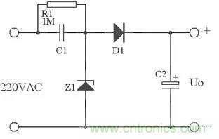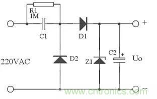 在實(shí)際應(yīng)用中,可以用下圖代替上圖,這里用了Z1正向特性和反向特性,其反向特性(也就是其穩(wěn)壓特性)來穩(wěn)定電壓,其正向特性用來在市電負(fù)半周給C1提供放電回路。