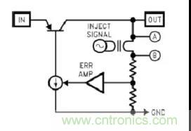 環(huán)路的不穩(wěn)定來自于相位移量,我們可以在反饋回路中通過變壓器注入正弦小信號(hào),如下圖所示,Loop Gain=Va/Vb,從Vb傳入交流小信號(hào),同過回路產(chǎn)生相移到達(dá)Va。這樣可以計(jì)算回路增益,相位的偏移量。(此處以LDO分析)