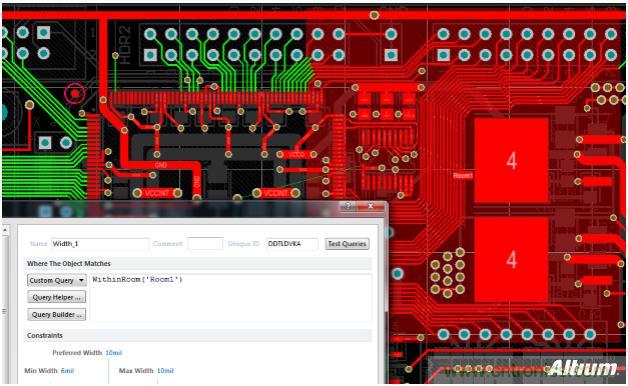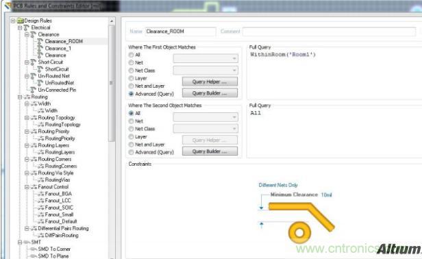在Room里框選出一定區(qū)域后,不僅僅是可以單獨(dú)設(shè)置線寬規(guī)則,還可以對(duì)它設(shè)置PCB Rule規(guī)則定義頁面上的任意規(guī)則。