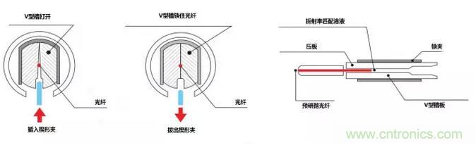 光纖快速連接器/冷接子可分為預置光纖和非預置光纖兩大類。預置光纖快速連接器/冷接子的接續(xù)點在連接器內部,并預置有匹配液;非預置光纖快速連接器/冷接子的接續(xù)點在連接器表面,不預置匹配液,直接通過適配器與目標光纖對接。非預置光纖快速連接器/冷接子的工作原理很簡單,這里不做贅述。下面詳細說明預置光纖快速連接器/冷接子的原理:如下圖所示,預置光纖膠接在插芯中,接續(xù)點設在放有折射率近似纖芯的導光材料-匹配液的V型槽中,從而實現預置光纖和目標光纖的無縫貼合。