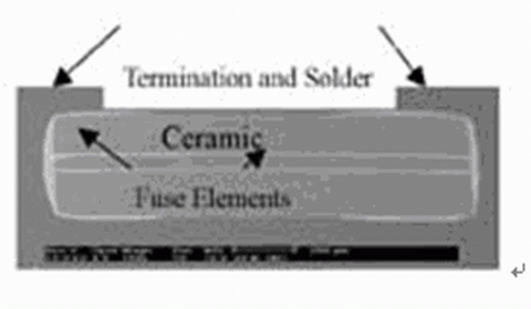 ---AEM SolidMatrix SMD熔斷器與常規(guī)片式熔斷器在結(jié)構(gòu)方面具有顯著的不同:它是疊層多元陶瓷獨石結(jié)構(gòu)。所謂多元就是指它具有分離的多層熔斷單元。熔斷單元之間用有很好滅弧作用的陶瓷材料隔開。熔斷單元位于陶瓷結(jié)構(gòu)的中部,夾在較厚的陶瓷層中間(見圖1)。其多層熔斷元件結(jié)構(gòu)可以大大增加熔斷元件與滅弧材料的接觸面積,使滅弧反應(yīng)的時間縮短。