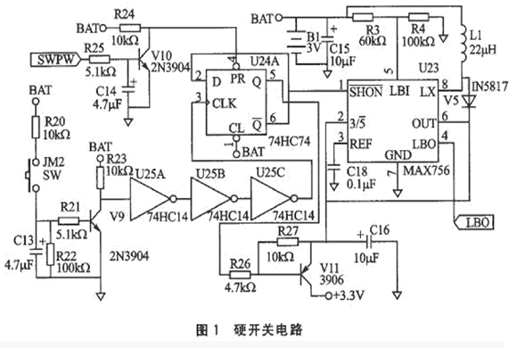 硬開關(guān)電路是將2節(jié)7號電池的串聯(lián)電壓通過DC/DC轉(zhuǎn)換器MAX756轉(zhuǎn)換成3.3 V的電壓,電路圖如圖1所示。如果不經(jīng)升壓電路而直接由電池供電,那么因電池端產(chǎn)生的電壓存在一個由高到低的下降過程。2節(jié)新電池的串聯(lián)電壓在3 V以上,隨著能量的耗盡,會下降到2V以下,導(dǎo)致機(jī)器無法正常工作。JM2按鍵為開/關(guān)機(jī)鍵,在按動JM2時,由于按鍵的抖動,會產(chǎn)生誤動作。由R20, C13, R21,R22, R23, V9構(gòu)成的充放電回路,作用是通過適當(dāng)?shù)剡x擇R20,C13,R21的值,使充放電回路的充電時間與放電時間都大于鍵抖動時間,從而有效地消除鍵的抖動。V9集電極輸出的按鍵脈沖經(jīng)去抖后,再通過U25 (74HC14)三個帶施密特觸發(fā)器的反相器進(jìn)一步濾波整形,產(chǎn)生波形完整的單脈沖。由該脈沖觸發(fā)U24A(74HC74 D觸發(fā)器)的翻轉(zhuǎn)。