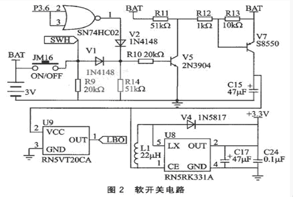 ② 在開機(jī)狀態(tài)下,JM16鍵作為關(guān)機(jī)鍵使用。未按下JM16鍵時,SWH信號點(diǎn)為低電平。按下JM16鍵,SWH信號點(diǎn)為高電平,這一信號變化通過鍵盤接口被單片機(jī)讀取;在開機(jī)時檢測到JM16的閉合,可確定為關(guān)機(jī)命令;等到JM16鍵松開后,單片機(jī)的P3.6輸出高電平并經(jīng)反相后通過V2使V5和V7變?yōu)榻刂範(fàn)顟B(tài),支付密碼器因為沒有電源供給而關(guān)機(jī)。在該供電電路中晶體管V7是電池供電的開關(guān)元件,將它設(shè)在DC/DC轉(zhuǎn)換電路的前面,關(guān)機(jī)時將DC/DC轉(zhuǎn)換器的供電回路完全切斷,進(jìn)一步減小了關(guān)機(jī)時的漏電流。整機(jī)關(guān)機(jī)后,經(jīng)檢測,關(guān)機(jī)電流小于5uA。圖2中的電池低電壓檢測報警由日本理光公司的RN5VT20CA(U9)實現(xiàn),檢測電壓為固定值2V。