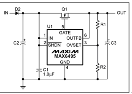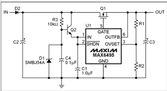 過壓保護(hù)(OVP)器件數(shù)據(jù)資料中提供的典型電路可以滿足大多數(shù)應(yīng)用的需求(圖1)。然而,有些應(yīng)用需要對基本電路進(jìn)行適當(dāng)修改。本文討論了兩種類似應(yīng)用:增大電路的最大輸入電壓,在過壓情況發(fā)生時(shí)利用輸出電容存儲(chǔ)能量。