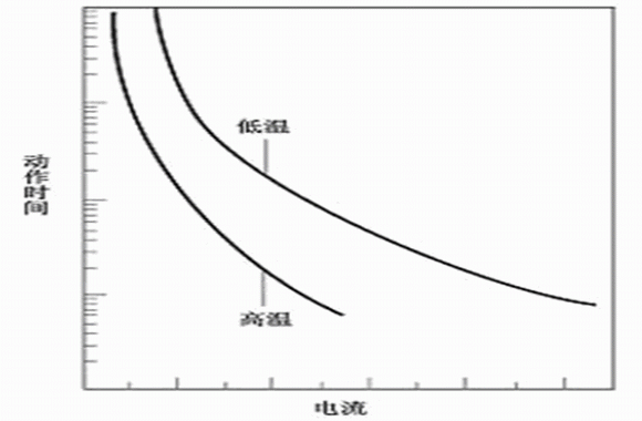 高分子PTC熱敏電阻是一種直熱式、階躍型熱敏電阻,其電阻變化過(guò)程與自身的發(fā)熱和散熱情況有關(guān),因而其維持電流(Ihold)、動(dòng)作電流(Itrip)及動(dòng)作時(shí)間受環(huán)境溫度影響。圖4為熱敏電阻典型的維持電流、動(dòng)作電流與環(huán)境溫度的關(guān)系示意圖。當(dāng)環(huán)境溫度和電流處于A區(qū)時(shí),熱敏電阻發(fā)熱功率大于散熱功率而會(huì)動(dòng)作;當(dāng)環(huán)境溫度和電流處于B區(qū)時(shí)發(fā)熱功率小于散熱功率,熱敏電阻將長(zhǎng)期處于不動(dòng)作狀態(tài);當(dāng)環(huán)境溫度和電流處于C區(qū)時(shí),熱敏電阻的散熱功率與發(fā)熱功率接近,因而可能動(dòng)作也可能不動(dòng)作。圖5為熱敏電阻的動(dòng)作時(shí)間與電流及環(huán)境溫度的關(guān)系示意圖。熱敏電阻在環(huán)境溫度相同時(shí),動(dòng)作時(shí)間隨著電流的增加而急劇縮短;熱敏電阻在環(huán)境溫度相對(duì)較高時(shí)具有更短的動(dòng)作時(shí)間和較小的維持電流及動(dòng)作電流。