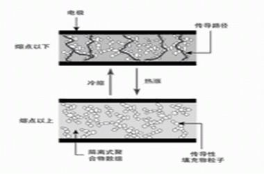 PPTC電路保護(hù)組件是以特殊塑料及傳導(dǎo)性粒子混合而成的傳導(dǎo)式聚合物,如圖1所示。在常溫下,該傳導(dǎo)性粒子會(huì)在聚合物中形成低阻值鏈路,當(dāng)溫度上升超過(guò)該組件的切換溫度時(shí),聚合物中的微晶粒就會(huì)熔化,變成非結(jié)晶狀。當(dāng)微晶粒階段熔化期間數(shù)量增加時(shí),會(huì)使傳導(dǎo)性粒子分離,導(dǎo)致該組件內(nèi)阻抗呈非線(xiàn)性增加。產(chǎn)生熱的原因是由于周?chē)h(huán)境或電池溫度上升所致,也可能受到過(guò)電流狀態(tài)下阻抗加熱引起,或是因前述不當(dāng)?shù)某潆姰a(chǎn)生。