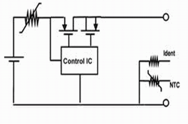 鋰離子電池盒一般包括有源過(guò)壓及過(guò)電流檢測(cè)安全電路(IC和MOEFET),以及串聯(lián)聚合物PTC組件,如圖5所示。若PPTC組件有低溫操作特性,在電池溫持續(xù)升高的情況下,它將以切斷充電或放電來(lái)提供過(guò)溫度保護(hù)。雖然半導(dǎo)體電路很可靠,在某些情況下故障也可能發(fā)生,例如靜電過(guò)度放電,高溫或在短路情況下的震動(dòng)等。