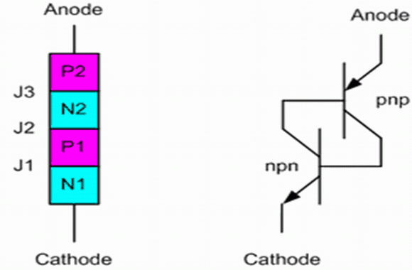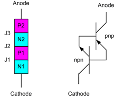 而當在陽極到陰極之間加一個負電壓偏置時,情況就完全不同了。因為此時只有J2處PN結是正向偏置,而這個正向偏壓PN結可以認為是這對雙極性晶體管的發(fā)射極和基極,這種非常規(guī)的情況如圖3所示 。同一個PN充當兩個三極管的發(fā)射極是不可能的。至于陽極到陰極成反偏壓的晶閘管情況很類似一個反向偏壓的二極管如圖4所示。