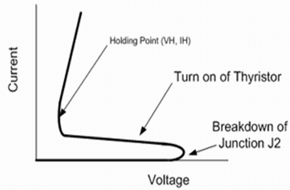 晶閘管的過壓保護設備是基于一對雙極性晶體管,這一對雙極性晶體管是由四層不同摻雜的N,P極組成,如圖1所示。N型摻雜的N1,P型摻雜的P1,和N型摻雜的N2分別構成NPN晶體管的發(fā)射極,基極和收集極,而P型摻雜的P2,N型摻雜的N2,和P型摻雜的P1分別構成了PNP晶體管的發(fā)射極,基極,和收集極。這樣一來一個晶體管的收集極是另外一個晶體管的基極。按這種方法那么一個晶體管的發(fā)射極到收集極流過的電流就是流向另一個晶體管的基極的電流。如果加一個從陽極到陰極的正電壓,那兩個三極管的發(fā)射極與基極之間,即J1和J3,都是正向電壓偏置。只有J2處PN結形成反向電壓偏置時才能阻礙電流流動。如果從陽極到陰極的電壓增加到大于J2處PN結的擊穿電壓,電流就開始直接流向兩個雙極性晶體管的基極。這使得兩個三極管都導通,會導致含有兩個三極管的晶閘管的電阻下降,并且晶閘管兩端的電壓也會減小。如圖2所示我們可以看到晶閘管的從陽極到陰極的正電流存在時的電壓-電流曲線。有著這樣的電壓-電流曲線特性的保護器件一定會有非常優(yōu)秀的保護特性。當保護器件在觸發(fā)后,工作電壓下降時保護器件可以承受大的電流并且自身功耗很小。事實上,具有這種電壓-電流曲線特性的保護器件通常被稱為“消弧”保護器件,因為這就好比是通過把一個“金屬消弧”放置在需要保護的端口來實現(xiàn)保護作用的。值得注意的是只有當電流或者電壓降到閾值點以下,才能使得晶閘管回到高阻態(tài),如圖2所示。