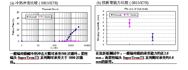 柔性端頭SuperTerm系列產(chǎn)品在板彎測試中產(chǎn)生破壞時,其破壞模式是開路模式,而。一般端電極開路或短路模式都會產(chǎn)生 。柔性端頭SuperTerm系列中的彈性層可從剖面圖中看見,其成份中含有〝高分子銀〞以產(chǎn)生此彈性效果。