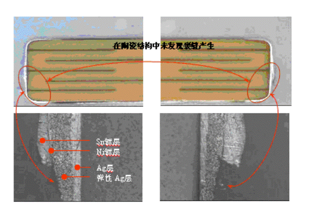 在破壞性的抗折板測試中,PCB板將持續(xù)彎曲直到貼片電容產(chǎn)生破壞為止,在這種模擬比較實(shí)驗(yàn)中,可以發(fā)現(xiàn)具有柔性端頭設(shè)計的產(chǎn)品中,沒有在陶瓷結(jié)構(gòu)中產(chǎn)生裂縫,而是從彈興銀層產(chǎn)生撕裂現(xiàn)象。