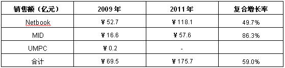 - 預(yù)計(jì)2009-2011年,中國(guó)超移動(dòng)筆記本電腦市場(chǎng)銷售額的年均復(fù)合增長(zhǎng)水平將達(dá)到59.0%。