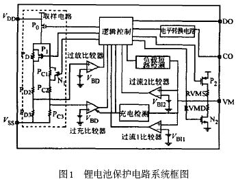 (3) 充電過流檢測: VM 端信號還可以反映電池接充電器時, 充電電流的大小, 再經(jīng)充電檢測比較器(CHARGEDETECTION ) 比較后, 由邏輯控制電路決定是否應停止充電。