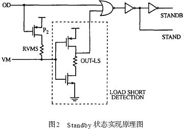 圖中信號OD 由數(shù)字電路產(chǎn)生, 當比較器檢測到電池電壓低于過放電檢測電壓, 并經(jīng)過延時后,OD 將從高電平變?yōu)榈碗娖? 此時通過P2 管將VM拉到高電平, 再經(jīng)反相后從負載短路輸出OUT_L S端輸出低電平, 使輸出端STAND 變?yōu)榈碗娖?STANDB 為高電平, 意味著系統(tǒng)可以進入Standby狀態(tài); 一旦電池充電開始時,VM 端迅速被置為低電平, 此時不管OD 如何, 都通過OUT _LS 將STAND恢復為高電平, 系統(tǒng)進入正常的檢測狀態(tài)。