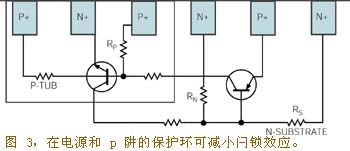 你可使用CMOS布局技術(shù)來防止閂鎖效應(yīng),因?yàn)镃MOS布局技術(shù)可監(jiān)控ESD瞬變會(huì)進(jìn)入器件的各部位:器件的電源引腳、輸入引腳和輸出引腳。你應(yīng)降低晶體管(PNP和NPN)的增益,并提高閂鎖效應(yīng)的閾值,方法是加大器件結(jié)構(gòu)中P溝道Tub與P溝道漏極之間的間隔。在電源和p-tub上連接p+和n+保護(hù)環(huán)也可以降低晶體管增益,提高閂鎖效應(yīng)的閾值(圖3)。防止閂鎖效應(yīng)的其他工藝技術(shù)有:提高阱深度以減少寄生晶體管的增益;采用絕緣襯底(如藍(lán)寶石硅)以降低tub和襯底中的電流,;在每個(gè)阱下面采用埋層或外延層(圖4)。
