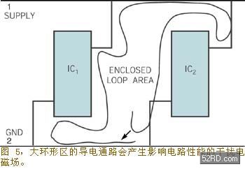 你如果使用布局和布線都很好的電路板,就可以顯著減少ESD問題的發(fā)生率(見附文《實(shí)現(xiàn)ESD故障最小化的電路設(shè)計(jì)原則》)。每一電路都因?yàn)橛胁煌愋偷脑骷碗娏鞫嬖谟徐o電通量線和磁通量線。如果電路板布線圍住很大的環(huán)形區(qū),則導(dǎo)電通路就會(huì)圍住較大的磁通量,由于環(huán)路起天線的作用,較大的磁通量又會(huì)在環(huán)路中感應(yīng)產(chǎn)生電流。這種環(huán)路電流會(huì)產(chǎn)生影響電路中元器件的干擾電磁場(chǎng)。減小環(huán)路區(qū)的方法是使電源線和地線盡量靠近在一起。圖5示出了典型的電源線和地線形成的環(huán)路區(qū)。