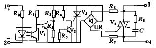過零觸發(fā)型AC—SSR為四端器件,其內(nèi)部電路如圖1所示。1、2為輸入端,3、4為輸出端。R0為限流電阻,光耦合器將輸入與輸出電路在電氣上隔離開,V1構(gòu)成反相器,R4、R5、V2和晶閘管V3組成過零檢測電路,UR為雙向整流橋,由V3和UR用以獲得使雙向晶閘管V4開啟的雙向觸發(fā)脈沖,R3、R7為分流電阻,分別用來保護(hù)V3和V4,R8和C組成浪涌吸收網(wǎng)絡(luò),以吸收電源中帶有的尖峰電壓或浪涌電流,防止對開關(guān)電路產(chǎn)生沖擊或干擾。