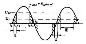 要指出的是所謂“過零”并非真的必須是電源電壓波形的零處,而一般是指在10~25V或-(10~25)V區(qū)域內(nèi)進(jìn)行觸發(fā),如圖2所示。圖中交流電壓分三個區(qū)域,Ⅰ區(qū)為-10V~+10V范圍,稱為死區(qū),在此區(qū)域中加入輸入信號時不能使SSR導(dǎo)通。Ⅱ區(qū)為10~25V和-(10~25)V范圍,稱為響應(yīng)區(qū),在此區(qū)域內(nèi)只要加入輸入信號,SSR立即導(dǎo)通。Ⅲ區(qū)為幅值大于25V的范圍,稱為抑制區(qū)在此區(qū)域內(nèi)加入輸入信號,SSR的導(dǎo)通被抑制。