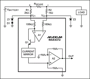 圖1給出了一個(gè)過壓保護(hù)例子,由齊納二極管Z1和Z2、電阻R1和R2以及二極管D1組成。MAX4372放大器的共模電壓范圍為0至28V,足以測量6V至18V范圍的汽車電池電壓。但是,拋負(fù)載電壓可能達(dá)到35V,而且會(huì)持續(xù)0.5秒,恰好超過了放大器的30V最大額定輸入電壓,必須通過外部電路保護(hù)放大器。