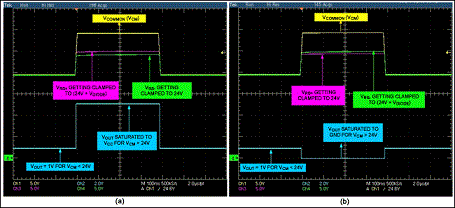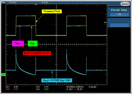 圖2是當(dāng)移走D1時(shí),35V拋負(fù)載脈沖下放大器的輸出。施加電壓為電池標(biāo)稱電壓,所要求的輸出電壓為1V(輸入VSENSE=50mV、增益=20)。出現(xiàn)拋負(fù)載電壓時(shí),齊納管把輸入共模電壓鉗位在大約24V,放大器輸出經(jīng)過幾個(gè)短暫的波動(dòng)后穩(wěn)定到0V。