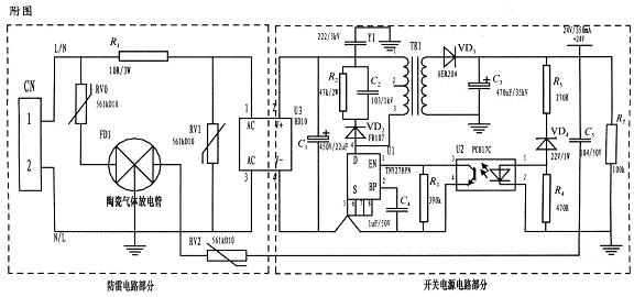 基于以上的技術缺陷和狀況,本文根據(jù)實際使用設計了一種基于壓敏電阻和陶瓷氣體放電管的單相并聯(lián)式抗雷擊浪涌的開關電源電路。