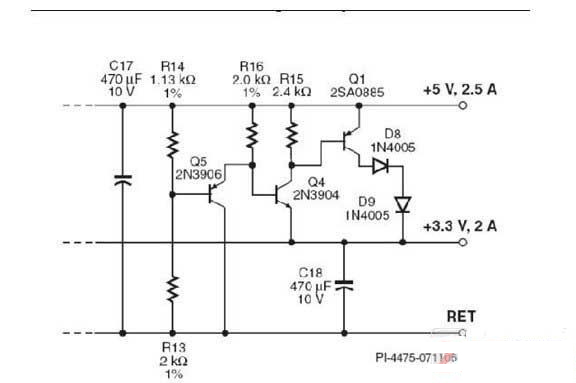 5V輸出端與3.3V輸出端的標(biāo)準(zhǔn)差異為1.7V。當(dāng)負(fù)載要求從3.3V輸出端獲得額外的電流,而從5V輸出端輸出的負(fù)載電流并未等量增加時(shí),其輸出電壓與3.3V輸出端的電壓相比將會(huì)升高。由于電壓差異約超過100 mV,Q5將偏置截止,從而導(dǎo)通Q4和Q1并允許電流從5V輸出端流到3.3V輸出端。該電流將降低5V輸出端的電壓,進(jìn)而縮小兩個(gè)輸出端之間的電壓差異。