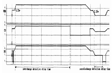 圖5為過(guò)充與過(guò)放電檢測(cè)的HSPICE仿真時(shí)序圖,從中可以看出,當(dāng)比較器檢測(cè)到電池過(guò)充,在這里過(guò)充檢測(cè)點(diǎn)為4. 25V,且該狀態(tài)保持時(shí)間達(dá)到過(guò)充電檢測(cè)延遲時(shí)間,在這里約為1. 2秒, CO輸出低電平,關(guān)斷充電用FET2,停止充電。當(dāng)檢測(cè)到電池過(guò)放電,這里過(guò)放電檢測(cè)點(diǎn)為2. 25V,且該狀態(tài)保持時(shí)間達(dá)到過(guò)放電檢測(cè)延遲時(shí)間約150毫秒,DO輸出低電平,關(guān)斷放電用FET1,停止放電。其它如放電過(guò)流檢測(cè)等功能經(jīng)HSP ICE仿真完全符合要求,在這里不一一列出。