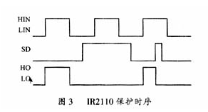 本設(shè)計(jì)逆變器為半橋式結(jié)構(gòu),串聯(lián)諧振負(fù)載,驅(qū)動(dòng)采用IR公司的IR2110半橋驅(qū)動(dòng)芯片。IR2110電路簡(jiǎn)單,成本低,適用于中大功率IGBT,實(shí)驗(yàn)結(jié)果也驗(yàn)證了IR2110驅(qū)動(dòng)中大功率IGBT的可行性。IR2110芯片有一個(gè)封鎖兩路驅(qū)動(dòng)的SD輸入端,當(dāng)此引腳為高電平時(shí),立刻封鎖兩路輸出,如圖3所示。