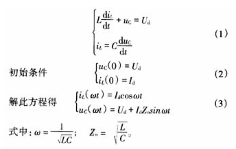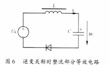假設(shè)逆變關(guān)斷時(shí)濾波電感中的電流全部從電容C中流過(guò),同時(shí)整流器繼續(xù)輸出電壓Ud。圖6給出了等效電路,L與C串聯(lián)諧振,由于整流橋電流只能單向流通,所以振蕩到T/4時(shí)結(jié)束。