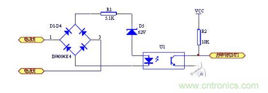 當(dāng)沒有振鈴信號時(shí),線路上的供電電壓為48V(部分交換機(jī)為60V),經(jīng)四個(gè)二極管構(gòu)成的全橋整流后,不足以使62V穩(wěn)壓管導(dǎo)通,振鈴信號輸出端電壓接近0V,當(dāng)振鈴信號到來時(shí),線路上的90V交流振鈴信號經(jīng)全橋整流變換后90V的脈動(dòng)直流電,其峰值足以擊穿耐壓值為62V穩(wěn)壓管,經(jīng)電阻R1給U1提供電壓,從光電耦合器輸出的波形是 時(shí)通時(shí)斷的方波方波信號,可以直接輸出至單片機(jī)的中斷輸入口, CPU可以根據(jù)振鈴信號光電轉(zhuǎn)換后的高低電平檢測有無振鈴。