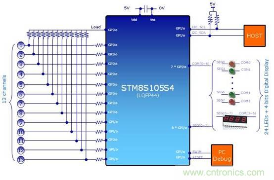 電磁爐是采用磁場(chǎng)感應(yīng)電流的加熱原理對(duì)食物進(jìn)行加熱。加熱時(shí),通過面板下方的線圈產(chǎn)生強(qiáng)磁場(chǎng),磁力線穿過導(dǎo)磁體做的鍋的底部時(shí),鍋具切割交變磁力線而在鍋具底部產(chǎn)生渦流使鍋底迅速發(fā)熱,達(dá)到加熱食物的目的。在本解決方案中采用44pin的STM8S105S4做按鍵顯示板的主控芯片,控制13個(gè)按鍵的掃描、24個(gè)LED及一個(gè)4位數(shù)碼管的顯示、I2C與主板的通訊,并留有一個(gè)SWIM接口方便工程師調(diào)試之用(如圖2)。