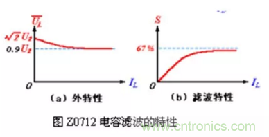 4. 電容濾波電路的外特性(指UL與IL之間的關(guān)系)和脈動特性(指S與IL 之間的關(guān)系)比較差,如圖Z0712 所示??梢钥闯鲚敵鲭妷篣L和脈動系數(shù)S隨著輸出電流IL 的變化而變化。當(dāng)IL=0(即RL= ∞ )時,UL = U2(電容充電到最大值后不再放電),S = 0。當(dāng)IL增大(即RL減小)時,由于電容放電程度加快而使UL下降,UL 的變化范圍在 U2 ~0.9 U2之間(指全波或橋式),S變大。所以,電容濾波一般適用于負(fù)載電流變化不大的場合。