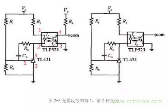 圖2-3所示接法的工作原理是:當輸出電壓升高時,原邊電流If增大,輸出電流Ic增大,由于Ic已經(jīng)超過了電壓誤差放大器的電流輸出能力,com腳電壓下降,占空比減小,輸出電壓減??;反之,當輸出電壓下降時,調節(jié)過程類似。