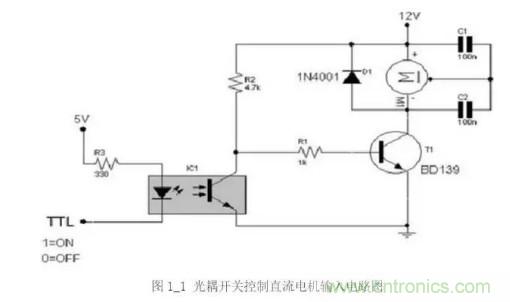 光耦(opticalcoupler)亦稱光電隔離器、光耦合器或光電耦合器。它是以光為媒介來傳輸電信號的器件,通常把發(fā)光器(紅外線發(fā)光二極管LED)與受光器(光敏半導體管)封裝在同一管殼內。當輸入端加電信號時發(fā)光二極管發(fā)出光線,光敏三極管接受光線之后就產(chǎn)生光電流,從輸出端流出,從而實現(xiàn)了“電—光—電”轉換。典型應用電路如下圖1-1所示。