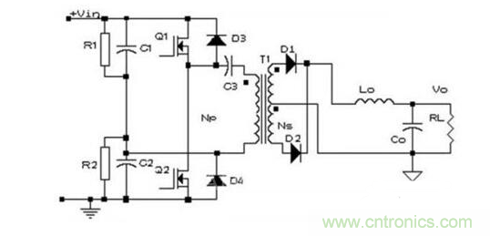 電容器C1和C2與開(kāi)關(guān)管Q1、Q2組成橋,橋的對(duì)角線(xiàn)接變壓器T1的原邊繞組,故稱(chēng)半橋變換器。如果此時(shí)C1=C2,那么當(dāng)某一開(kāi)關(guān)管導(dǎo)通時(shí),繞組上的電壓只有電源電壓的一半。