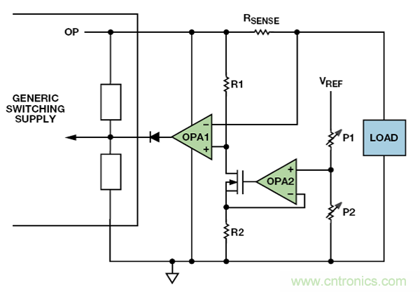 為了得到可變的電流,將基準電壓——來自黑磚頭或本地——施加于P1 和P2 所代表的電位計。OPA2 和MOSFET通過R1 輸出小電流,在其上產(chǎn)生壓降。負載電流流過檢測電阻。若檢測電阻上的電壓由于負載電流超過R1 上的壓降而有所下降,那么OPA1 輸出將上升,覆蓋磚頭中的電壓控制,并限制其輸出電壓,防止輸出電流超過限值。