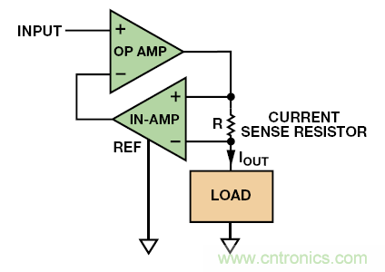 現(xiàn)在,高性能儀表放大器售價不高,因此使用一個運算放大器、一個儀表放大器和一個電流檢測電阻組成雙極性電流源極為方便,如圖 10 所示。這類電路比Howland電流泵要更為簡單,不依賴于電阻網(wǎng)絡(luò)(除了集成儀表放大器的那種),且電壓擺幅在每個電源的 500 mV以內(nèi)。