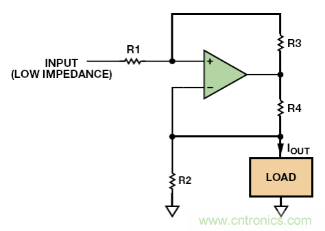 目前為止,我們討論的電路都是單極性的——電流在一個方向上流動——但雙極性電流電路也是可行的。最簡單、使用最廣泛的當數(shù)Howland電流泵,如圖 9 所示。這款簡單的電路有很多問題:它對電阻匹配的精度要求極高,以獲得高輸出阻抗;輸入源阻抗會增加R1 電阻,因此它的數(shù)值必須非常低以最大程度降低匹配誤差;電源電壓必須比最大輸出電壓高得多;并且運算放大器的CMRR性能必須相對良好。