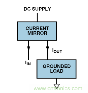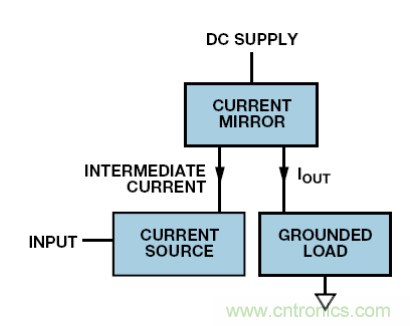 若電流或電壓輸入?yún)⒖嫉?,則必須使用電平轉(zhuǎn)換。有多個電路可以實現(xiàn);而圖 8 中的系統(tǒng)在很多場合下都適用。這款簡單的電路采用接地電流源驅(qū)動直流電源上的電流鏡,從而驅(qū)動負載。注意,電流鏡可能有增益,因此信號電流不需要像負載電流那么高。