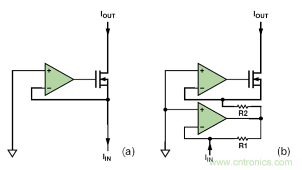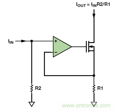 若單芯片IC中需要用到電流鏡,則最好使用簡單的晶體管電流鏡。然而,若采用分立式電路,其匹配電阻高昂的價格(價格高是因為需求量有限,而非制造困難)將使圖 5 中的運算放大器電流鏡成為最便宜的技術(shù)。該電流鏡由跨導(dǎo)放大器和一個額外的電阻組成。